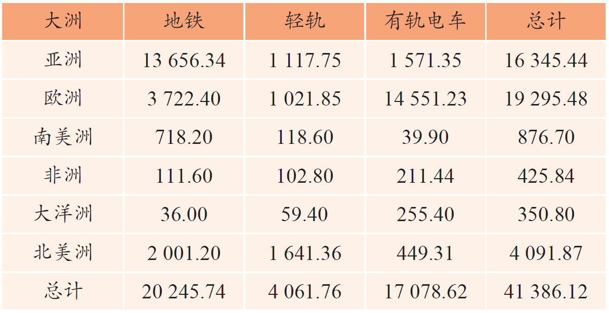 A Figura 1 mostra a escala geral do trânsito ferroviário urbano nos principais continentes do mundo (Nota: Todas as cidades da Rússia são classificadas na Europa para cálculo). Os dados indicam que os metropolitanos e os eléctricos são os principais tipos de transporte ferroviário urbano a nível mundial, e o trânsito ferroviário urbano global está concentrado principalmente na Eurásia, com os metropolitanos distribuídos principalmente nos países asiáticos.[1]