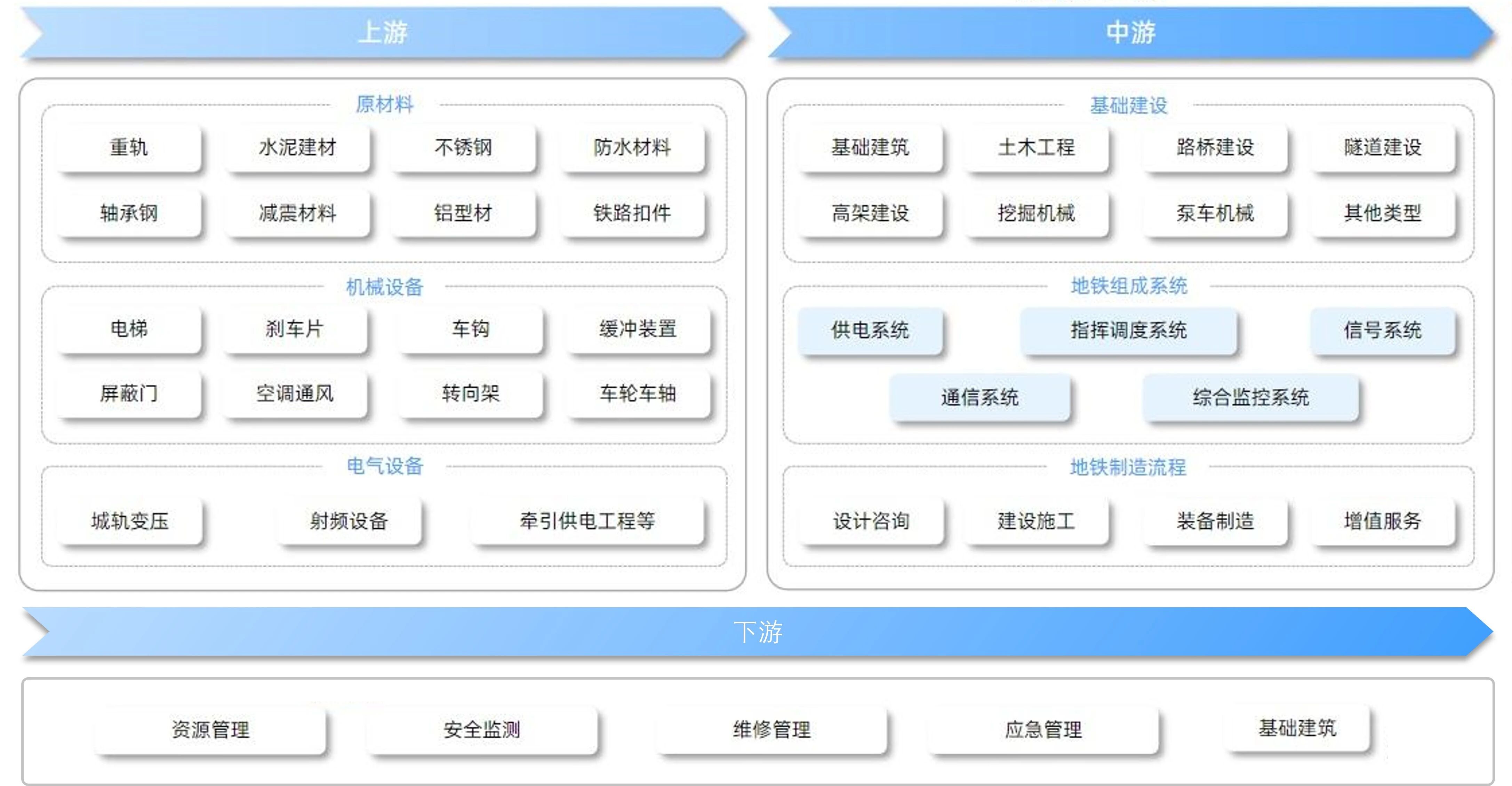 O trânsito ferroviário conecta as indústrias urbanas, promove a extensão da cadeia industrial e impulsiona o rápido desenvolvimento de indústrias de apoio, como a fabricação de equipamentos e a P&D tecnológica. A cadeia da indústria metroviária é mostrada na Figura 3, onde todos os elos são interdependentes e impulsionam o desenvolvimento económico das aglomerações urbanas e áreas metropolitanas.[2]
